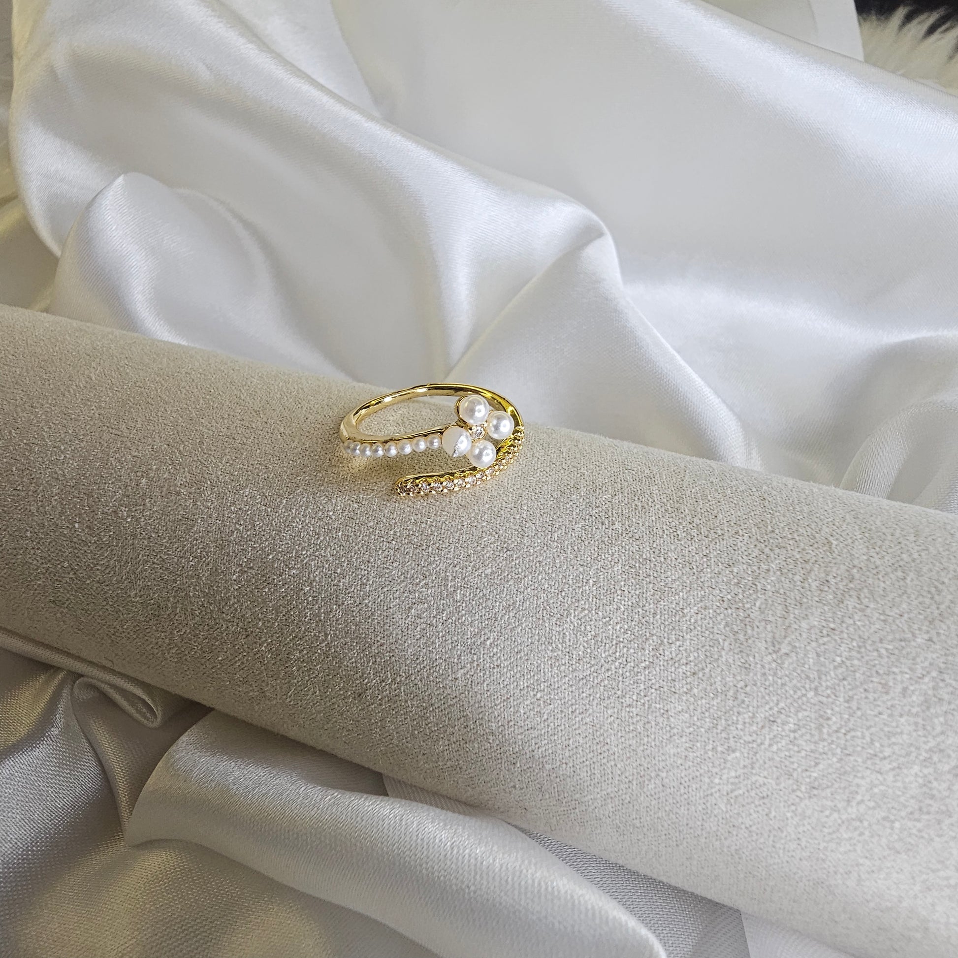 | Gold-toned wrap-around ring decorated with a cluster of small pearls and a pave of clear stones. |