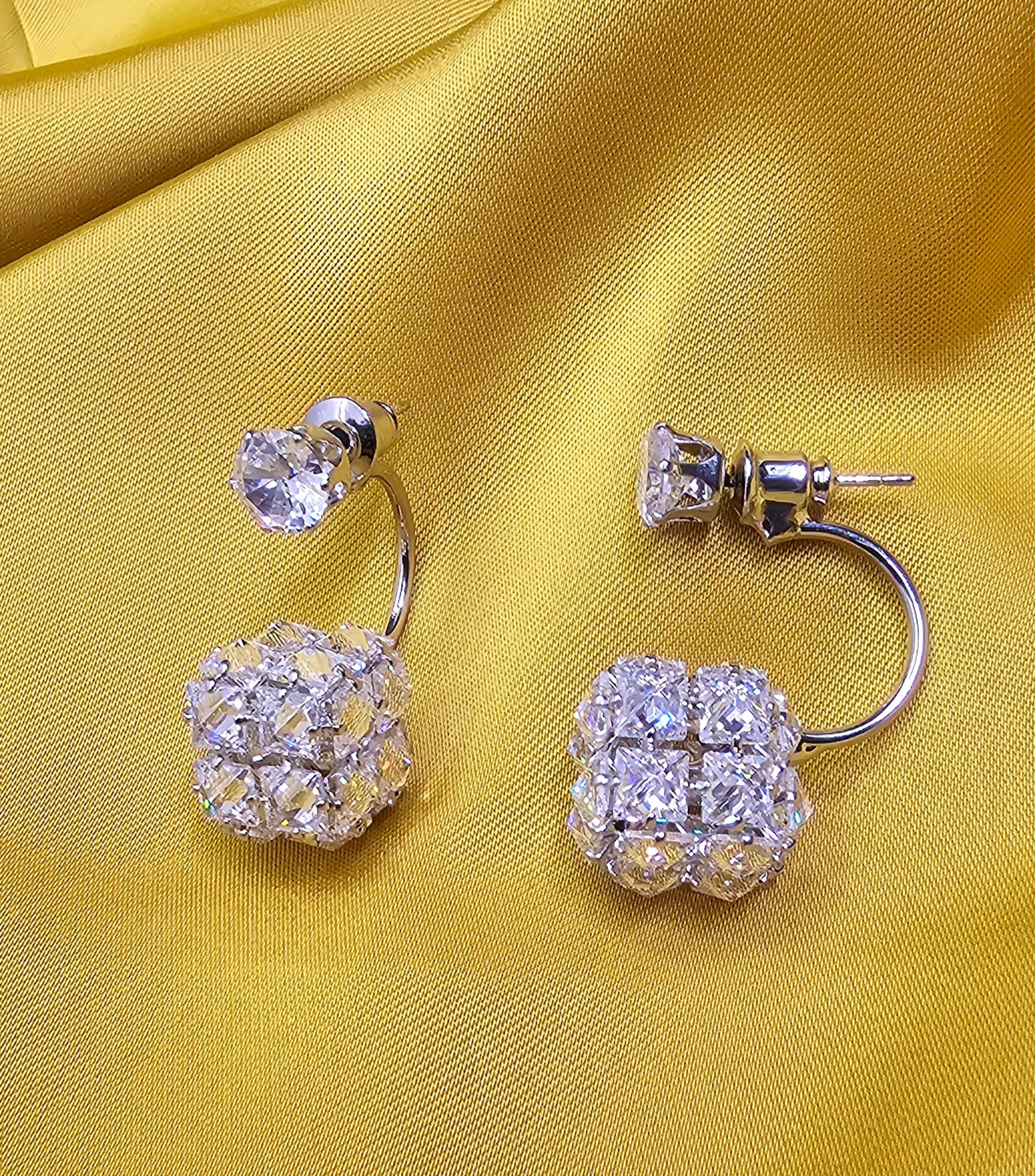 Chic front-back style earrings featuring a solitaire crystal stud with a sparkling, multi-faceted crystal cluster curving beneath the lobe.