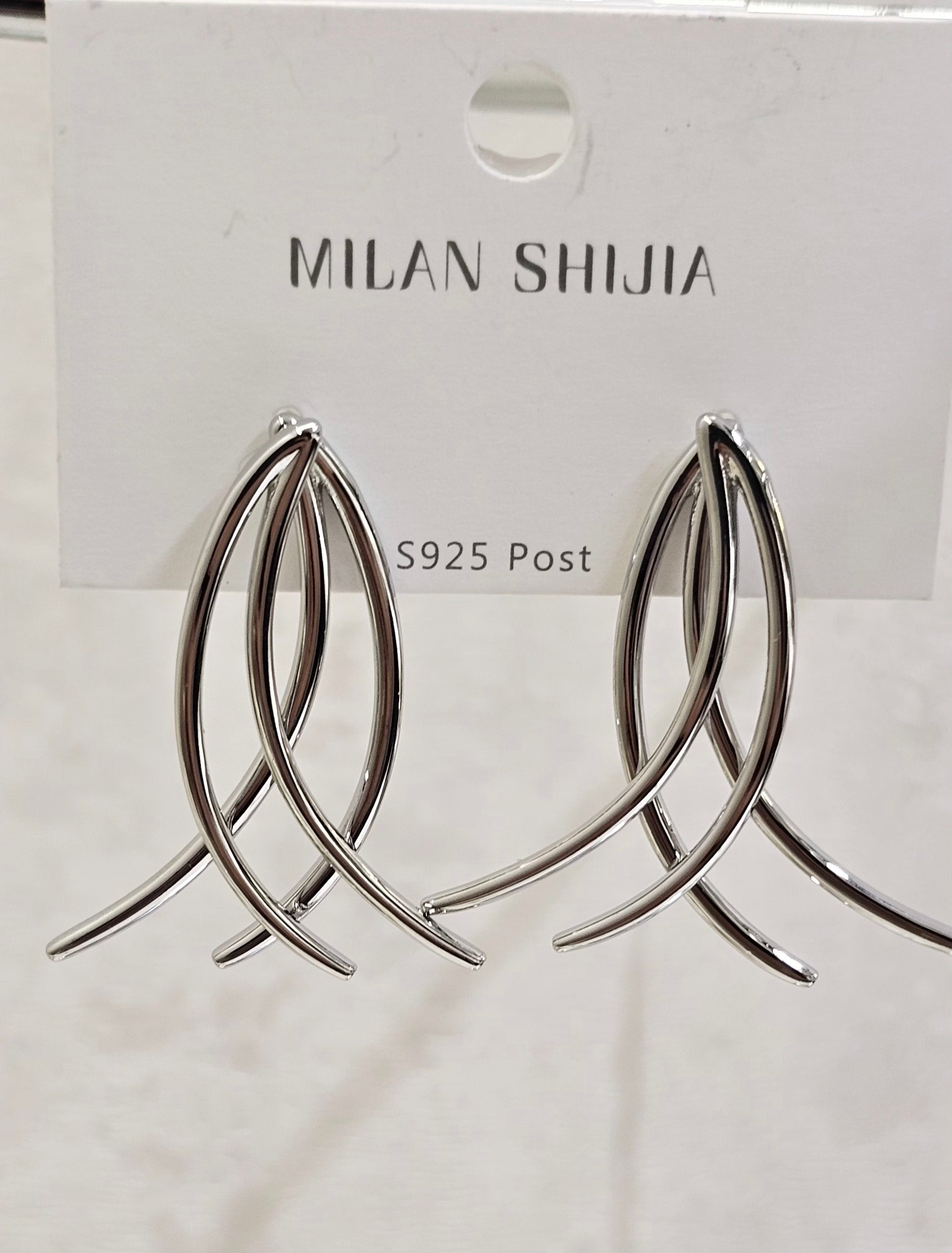 Modern silver earrings featuring gracefully crossing and intersecting polished lines for an artistic drop silhouette.