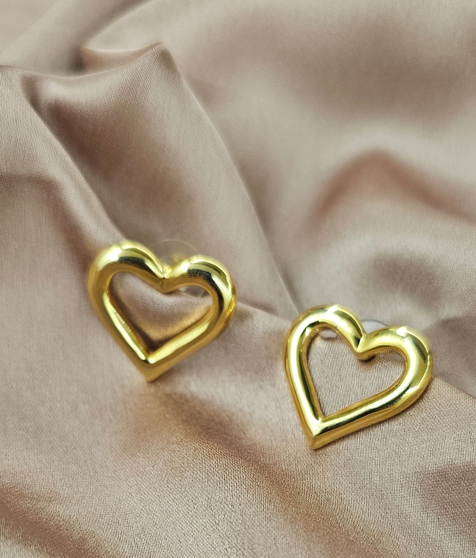 | Classic and sweet oversized stud earrings featuring a sleek, high-shine polished gold open heart silhouette. A timeless, versatile design. |
