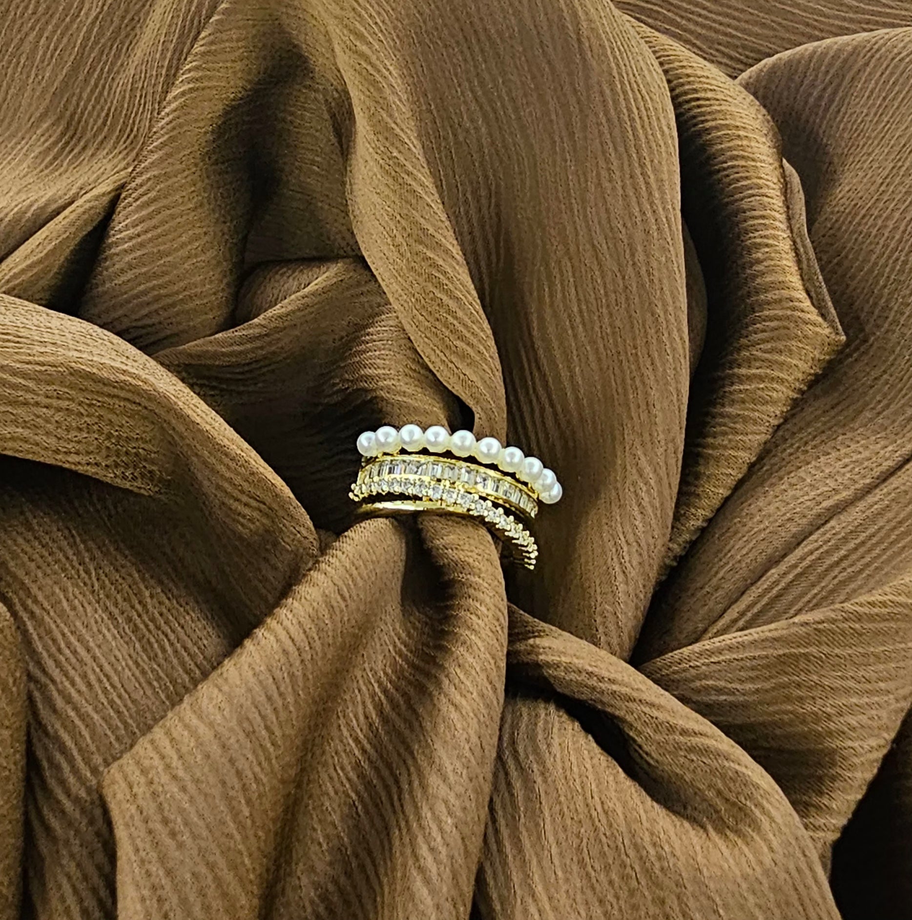 A multi-band ring with the look of stacked jewelry, featuring rows of small pearls and sparkling pave-set clear cubic zirconia on a gold-toned base.
