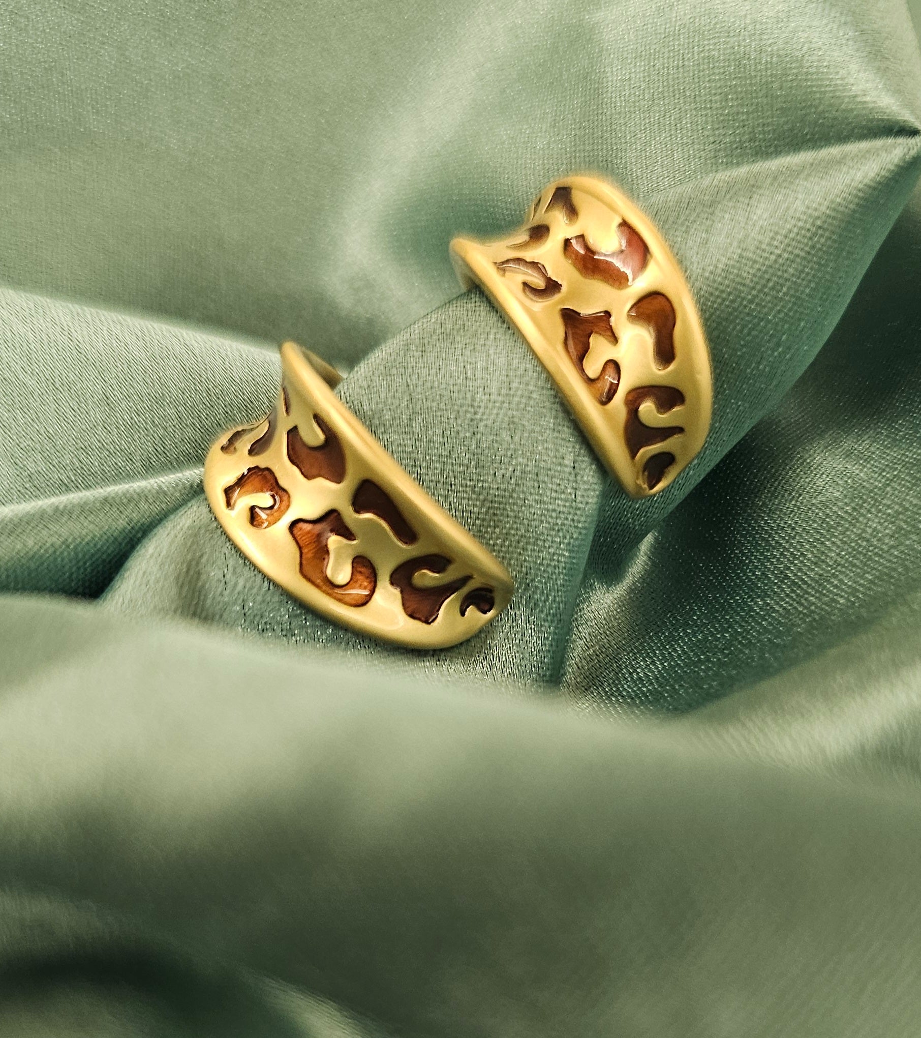 Bold small hoop/cuff earrings with a modern, curved and tapering shape. Features a trendy gold and brown enamel leopard print inlay design.